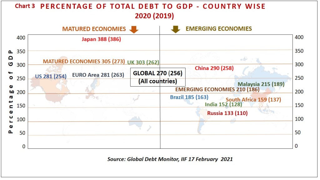 In absolute terms, covid 19 surging the globe, the year 2020 has added $24 trillion to reach the peak of $281 trillion. The pandemic plays a double impact on the percentage figure. (a) Rise in the debts as a result of relief and stimulus measures undertaken by the governments entail huge funds, raised by borrowing and the corporates and individuals resorting to borrowing against drop in their cashflow. (b) Fall in GDP due to reduction in production days caused by extended lockdowns to ward off the pandemic.