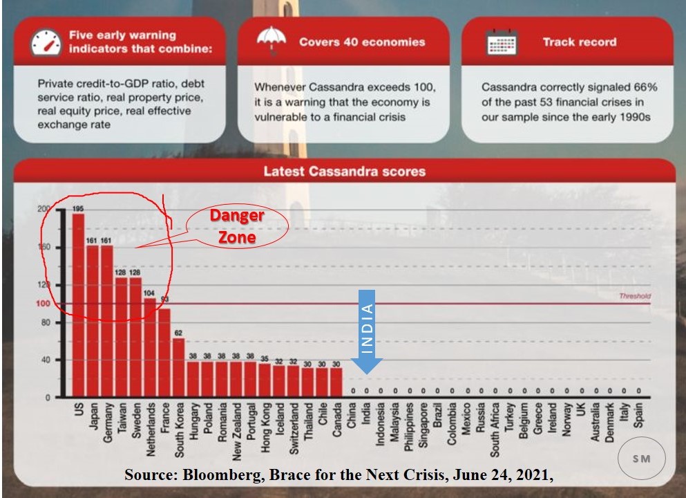 What about India? According to the Cassandra chart given above, India is outside the danger zone. That is to say that the probability for India plunging into financial crisis is very low, along with China, Indonesia, Malaysia, Philippines, Singapore, Brazil and others. India has no imminent danger of a financial crisis. We have another encouraging finding on India. The UN briefing in July 2021 [3] states that strong economic rebound during the latter part of 2020 was experienced in countries such as China, India, Malaysia, Peru and Turkey. UN briefing adds that these countries need to sustain a strong growth momentum in coming years to emerge out of the situation. To continue with positive news in this front, World Economic Outlook Projections by IMF [5] denotes India’s GDP growth in 2021 and 2022 at 9.5% and 8.5% respectively, the highest among all the countries. India is projected to take lead in the recovery process.
