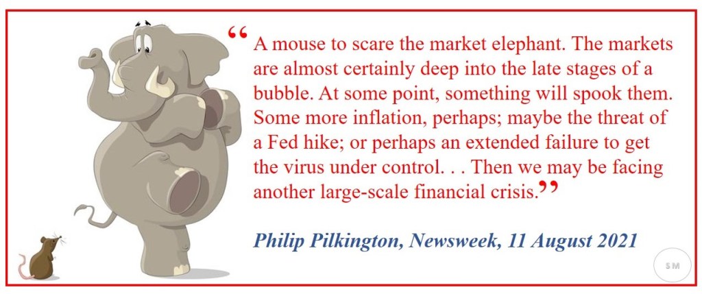 The captions vary from: the economy is dead – crisis is coming – nothing to stop crisis – prepare ourselves for crisis. Philip Pilkington, [1] the economist states “A mouse to scare the market elephant. The markets are almost certainly deep into the late stages of a bubble. At some point, something will spook them. Some more inflation, perhaps; maybe the threat of a Fed hike; or perhaps an extended failure to get the virus under control. . . Then we may be facing another large-scale financial crisis” according to him the crisis is imminent, but do not know how and when.