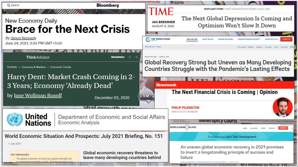 Latest UN briefing in July 2021[3] does not even hint at an economic crisis and states that global recovery will be uneven and will be varying from economy to economy, region to region and country to country, depending on the rate of vaccination and opening up of the economy, effectiveness of government stimulus packages, dependence on international tourism and so on.