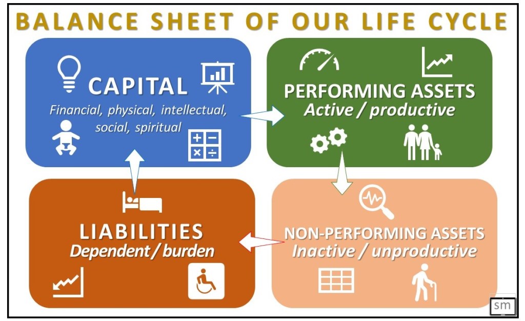 While a balance sheet pertains to only financial affairs, our life cycle goes beyond financial dealings. When we are born on this earth we are looked upon with many expectations. The parents, family, and society spend money, time, and effort in molding the child physically, intellectually, socially, and spiritually.