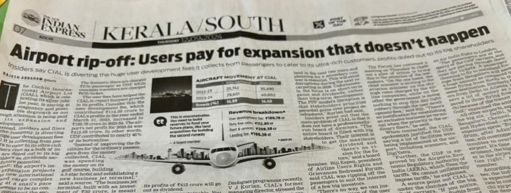The above newspaper report exposed a few management practices at Cochin International Airport Limited (CIAL), which are of great concern. The company allegedly misallocates the substantial User Development Fees (UDF) collected from passengers to benefit its affluent passengers. It deals out hefty dividend payouts to major shareholders, rather than reinvesting in the airport’s future growth. This short-sighted approach neglects the required reserve funding for critical projects, such as land acquisition for a second runway.