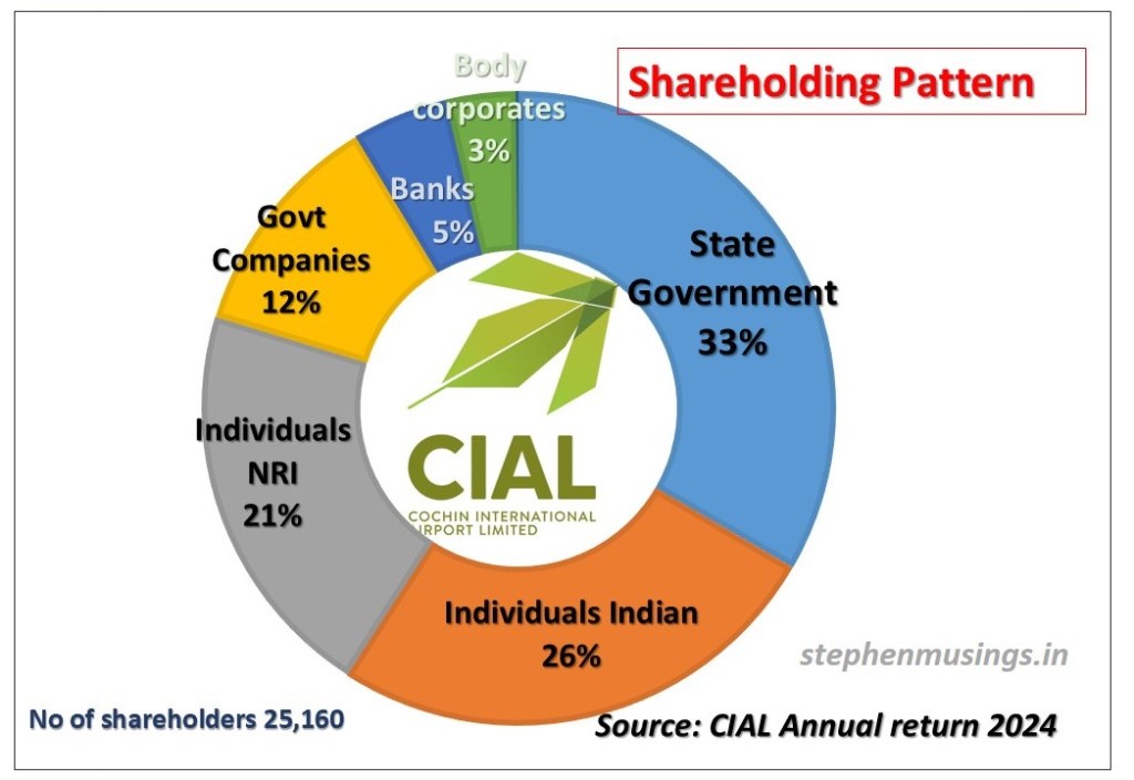 CIAL is not a government company, since its shareholding is less than 51%, but the government still maintains control through its larger stake. The Board of Directors is a mix of government officials and private investors. The Chief Minister serves as the Chairman, an IAS officer as the Managing Director, two state cabinet ministers, a chief secretary, two government nominees, and four representatives of the investors. This is practically an erstwhile government company but is entrepreneurial and business-like with a due representation for individual investors on the board. The Kerala Chief Ministers who followed, from both the left and right coalitions, who alternated as Chairman after each election, consistently supported the company.