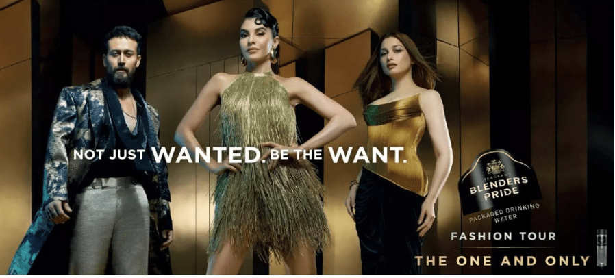 The advertisement features a stage show, leaving us curious about the product being promoted. If we pay close attention, the final shot reveals Blenders Pride Packaged drinking water Fashion tour.
