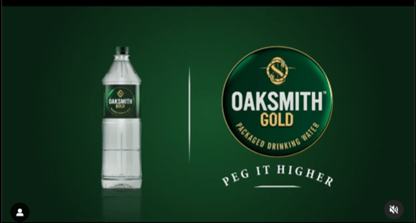 The advertisement begins with the signboard of Oaksmith Style Studio but concludes with the logo of Oaksmith Gold packaged drinking water and the tagline “Peg it higher.” The visuals do not correspond with the product, which serves as a surrogate for the well-established whisky, Oaksmith Gold.