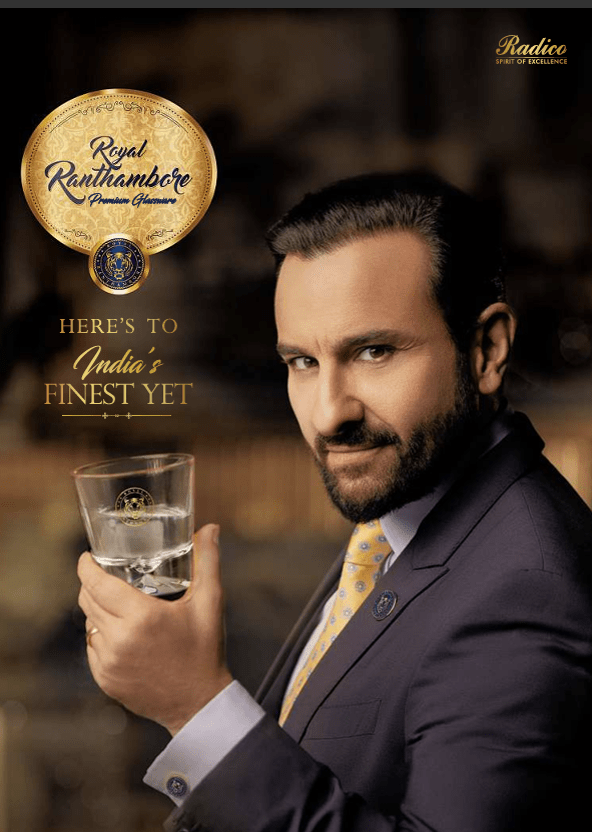 The product featured in the second advertisement is Royal Ranthambore Premium Glassware, and it has a picture of Saif Ali Khan holding the branded glass tumbler. According to news from business pages, the company plans to launch Royal Ranthambore Whisky through the Canteen Stores Department (which serves defense personnel and ex-servicemen) starting on February 20, 2025. The premium glassware advertised serves as a surrogate for the whisky of the same brand.