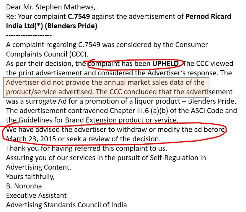 In 2015, I submitted a complaint to ASCI on the advertisement for Blenders Pride shown below.