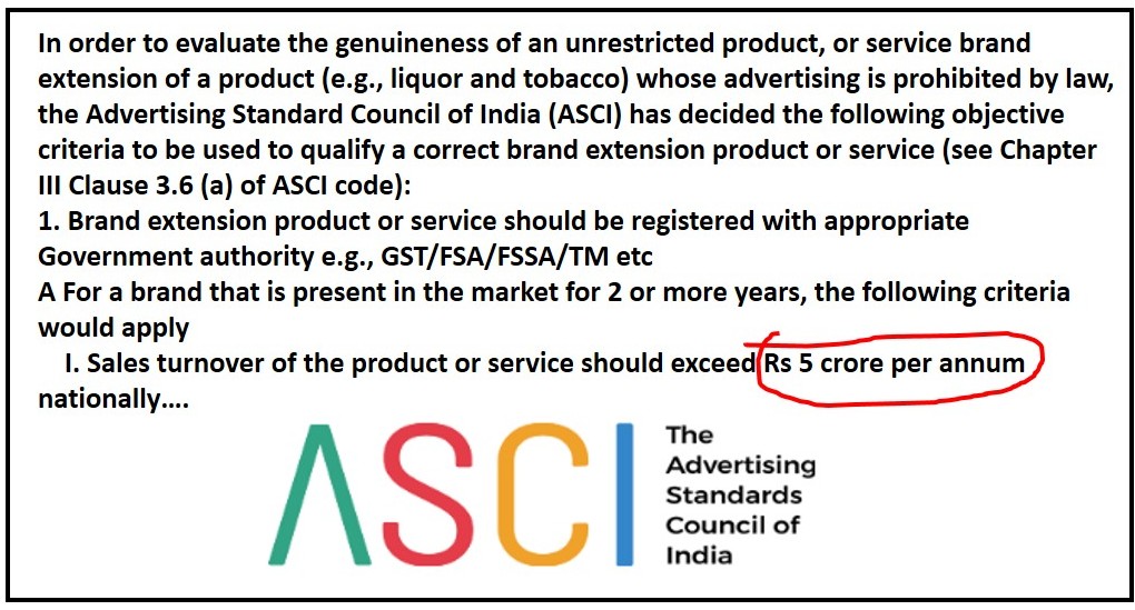 According to ASCI guidelines, if a brand reports an annual sales turnover of Rs 5 crores or above, it will be considered genuine, and the advertisement will not be classified as a surrogate. This is the litmus test. For instance, if Teacher’s packaged drinking water reports annual sales of Rs 5 crores or more, its advertisement will not fall under surrogate advertisements.