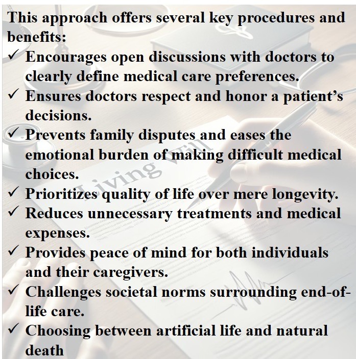 Safeguards: To ensure the legitimacy of a living will and prevent misuse, government guidelines mandate approval from two medical committees before its implementation. One committee, consisting of three doctors, is formed within the hospital where the patient is admitted, while the other is constituted by the district medical officer.
