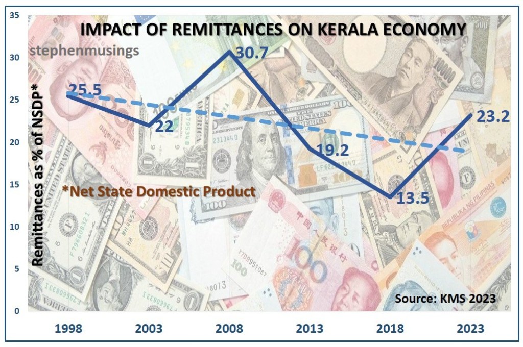Kerala Migration Survey (KMS) 2023 data shows that foreign remittances now account for 23.2% of Kerala’s Net State Domestic Product (NSDP), up from 13.5% in 2018. This means nearly one-fourth of the state’s economic output is directly linked to money sent home by Keralites working abroad. In 2023. In 2023, remittances were 1.7 times greater than the state’s total revenue receipts, highlighting their outsized influence on public finances and spending capacity.